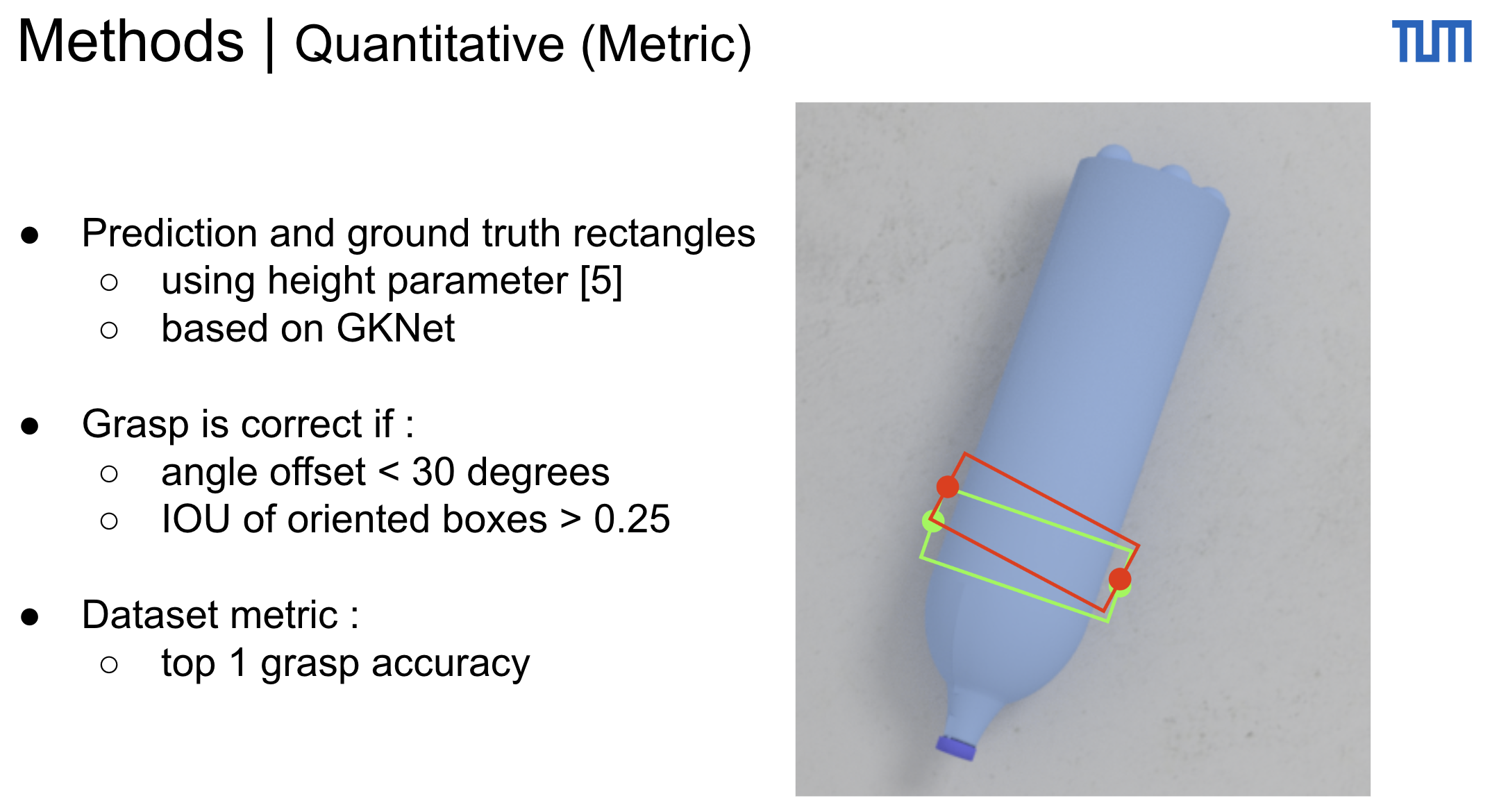 We categorize the Jacquard dataset into 4 main categories with around 100 different objects each. For our metrics we use the standard metrics proposed in the Jacquard dataset which are based on the angle offset of the grasp and the iou between height boxes which are constructed from the two grasp points and a fixed height parameter provided by the datasedm which is based on the gripper size.