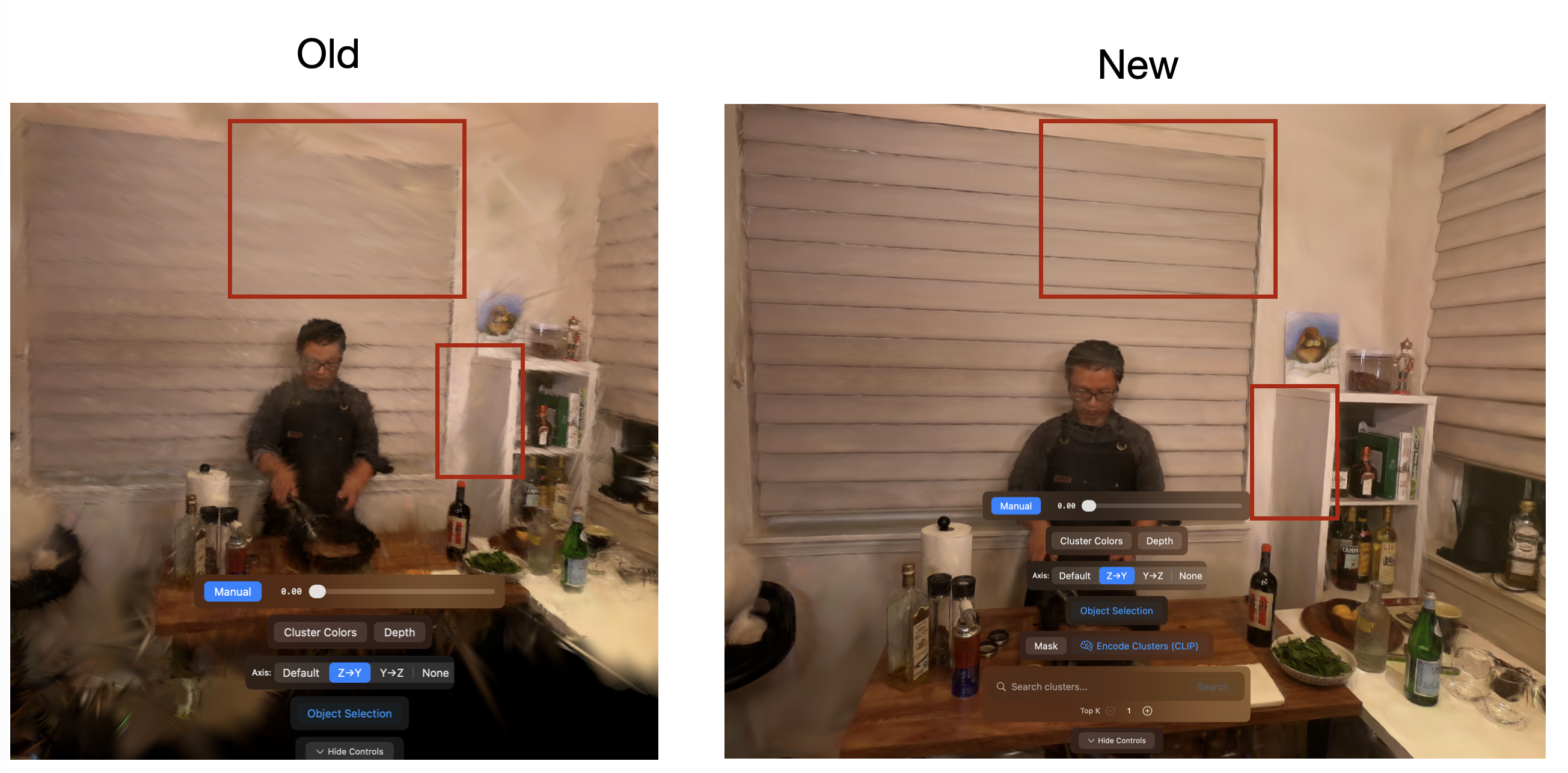We later added support for instance-aware gaussian splats by integrating the TRASE cluster support which enables cluster visualisation and cluster-based selection of gaussian splats. Additionally, the deformation network is accelerated via optional FP16 support yielding about 2x faster inference speed. Integrating the clustering workflow can allow for interactive selection of regions based on the TRASE clusters as visualised below: