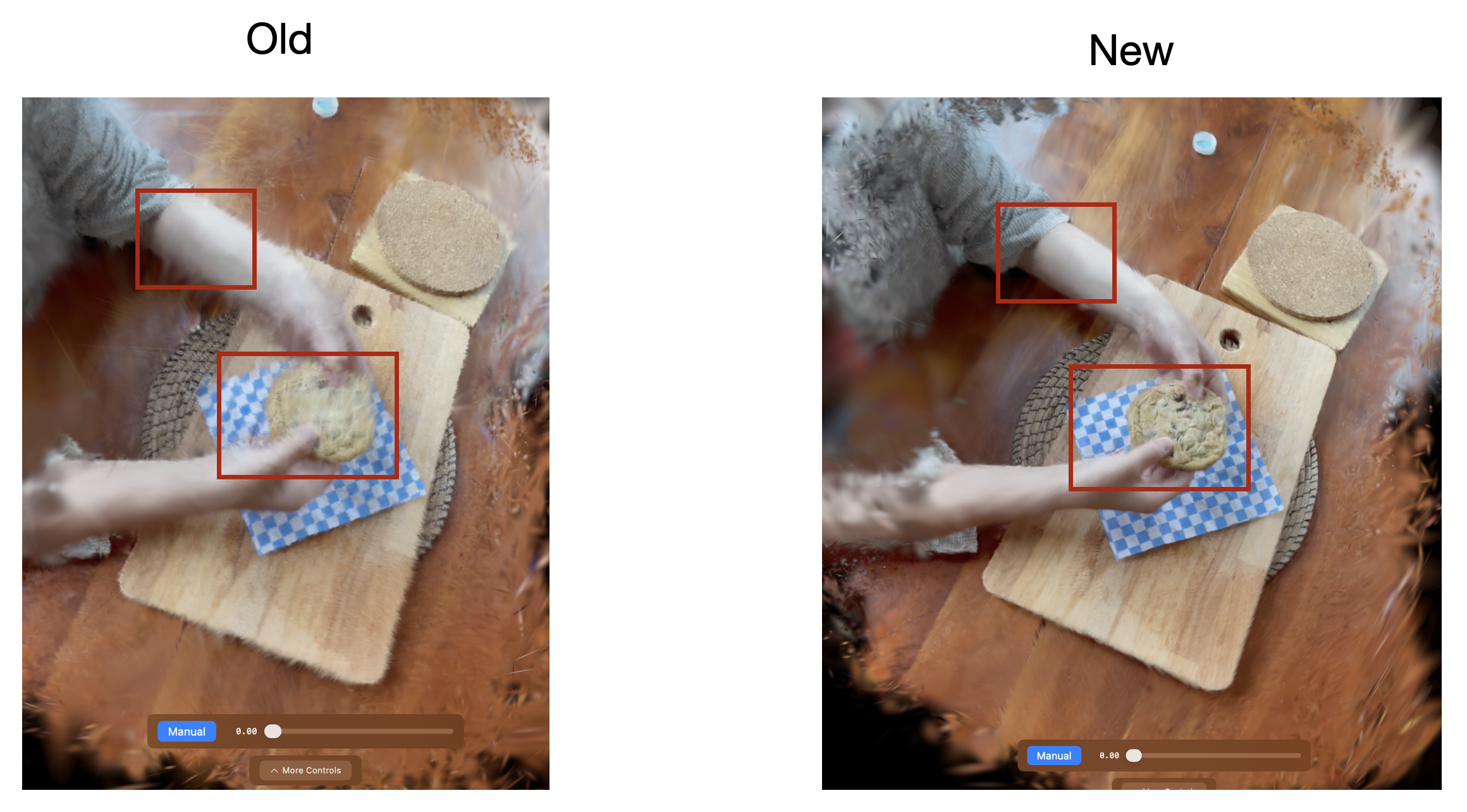 We visualize the improved rendering quality in deformation mode below: